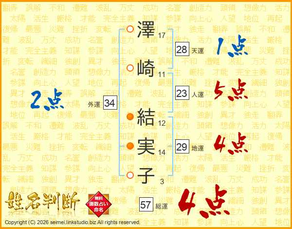 澤(17画)崎(11画) 結(12画)実(14画)子(3画)