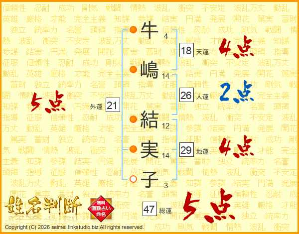 牛(4画)嶋(14画) 結(12画)実(14画)子(3画)