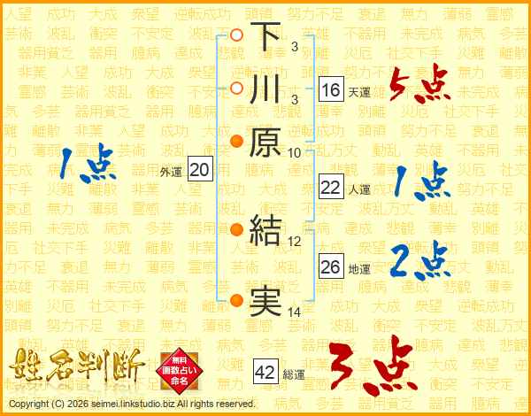 下(3画)川(3画)原(10画) 結(12画)実(14画)
