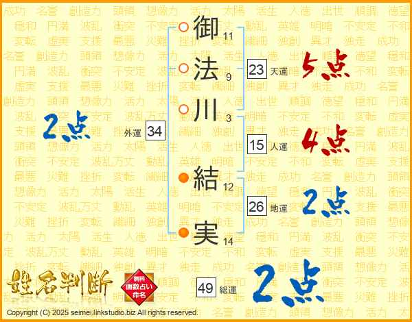 御(11画)法(9画)川(3画) 結(12画)実(14画)