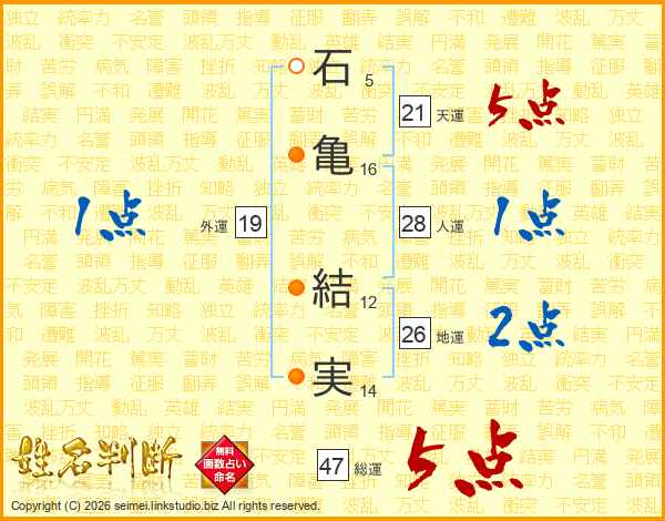 生活面を象徴する運勢です。外部から受ける影響力を表し、結婚運、家庭運や職場、環境への順応性を表します。総運から人運を引いた画数。姓や名が1文字の場合を除く。