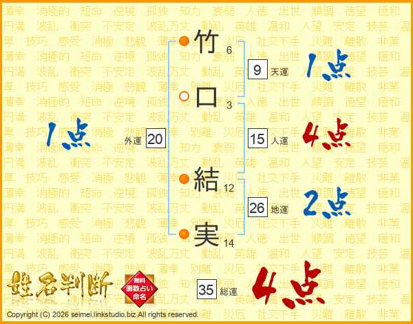 竹(6画)口(3画) 結(12画)実(14画)