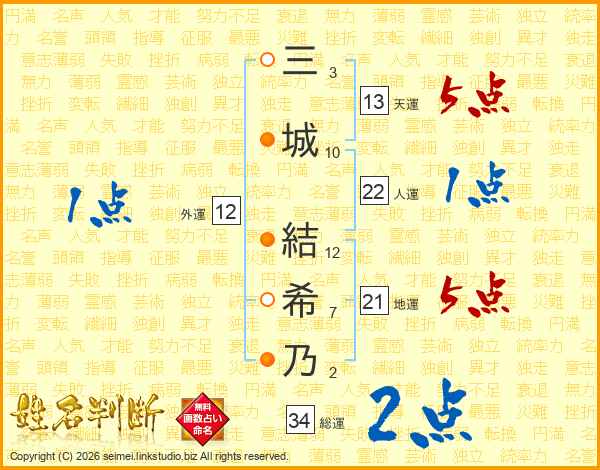 三城結希乃さんの総運は34画の2点!
