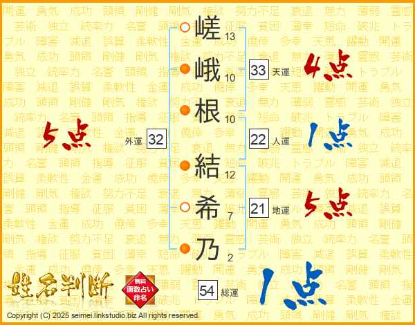 嵯(13画)峨(10画)根(10画) 結(12画)希(7画)乃(2画)