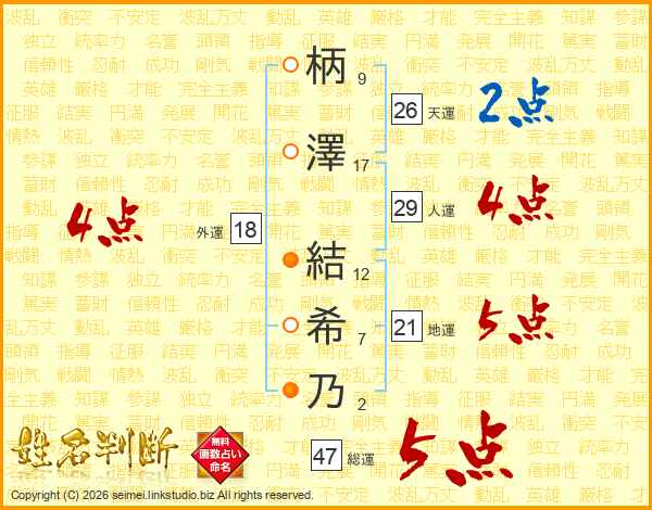 柄(9画)澤(17画) 結(12画)希(7画)乃(2画)
