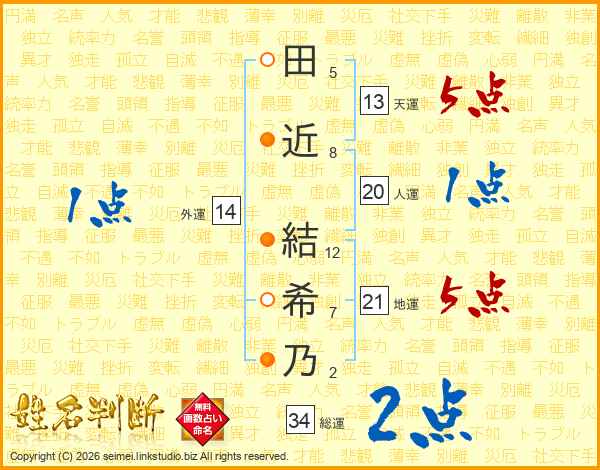 田(5画)近(8画) 結(12画)希(7画)乃(2画)