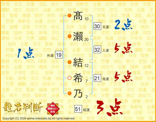 髙(10画)瀨(20画) 結(12画)希(7画)乃(2画)