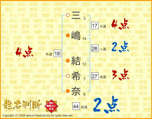 三(3画)嶋(14画) 結(12画)希(7画)奈(8画)