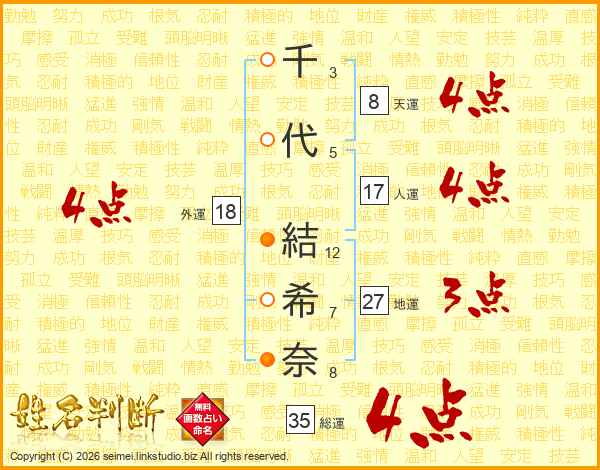 千(3画)代(5画) 結(12画)希(7画)奈(8画)