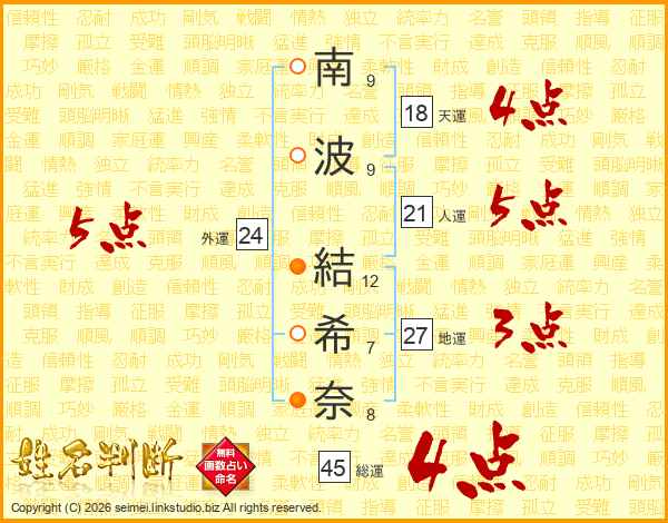 南(9画)波(9画) 結(12画)希(7画)奈(8画)