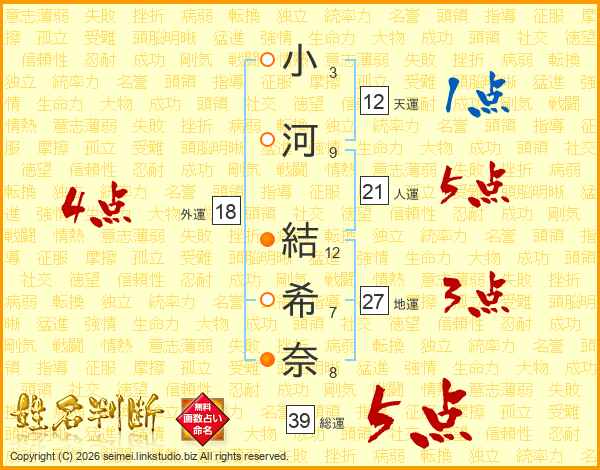 小(3画)河(9画) 結(12画)希(7画)奈(8画)