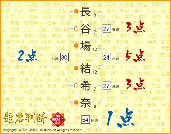 長(8画)谷(7画)場(12画) 結(12画)希(7画)奈(8画)