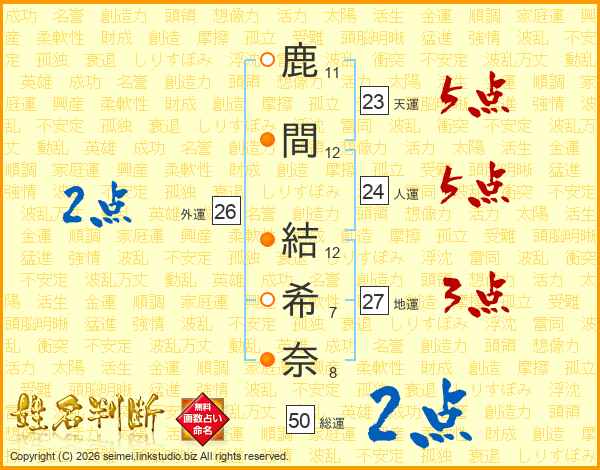 鹿(11画)間(12画) 結(12画)希(7画)奈(8画)