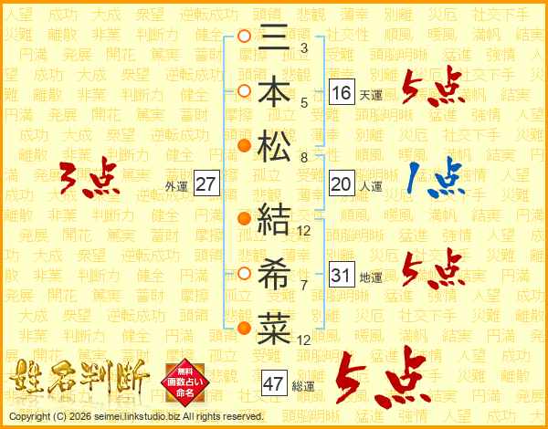 三(3画)本(5画)松(8画) 結(12画)希(7画)菜(12画)