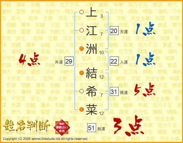 上(3画)江(7画)洲(10画) 結(12画)希(7画)菜(12画)