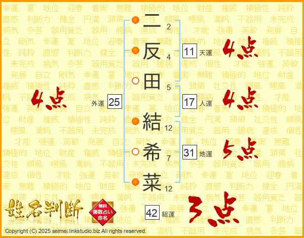二(2画)反(4画)田(5画) 結(12画)希(7画)菜(12画)