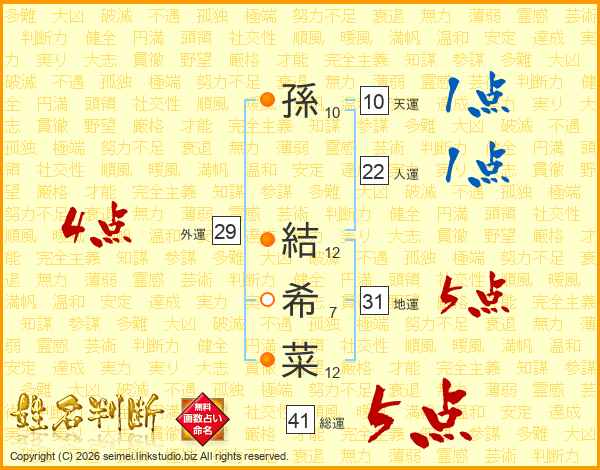 孫結希菜さんの総運は41画の5点!