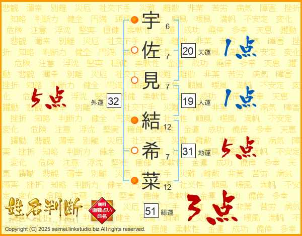 宇(6画)佐(7画)見(7画) 結(12画)希(7画)菜(12画)