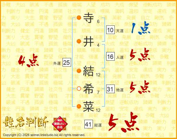 寺(6画)井(4画) 結(12画)希(7画)菜(12画)