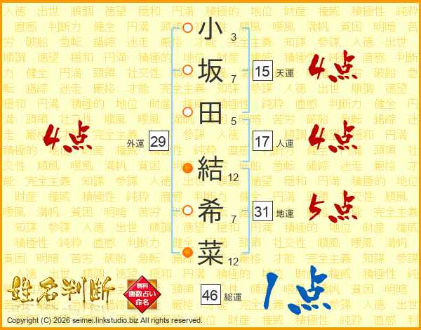 小(3画)坂(7画)田(5画) 結(12画)希(7画)菜(12画)