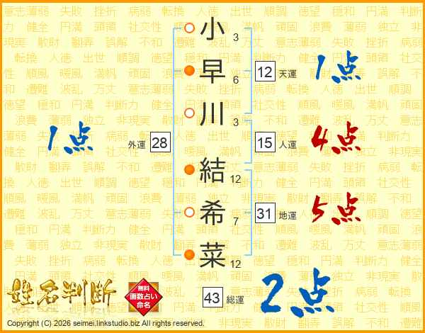 小早川結希菜さんの総運は43画の2点!