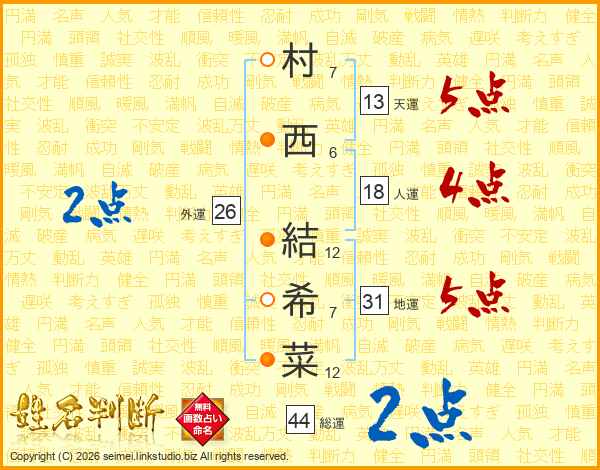 村(7画)西(6画) 結(12画)希(7画)菜(12画)
