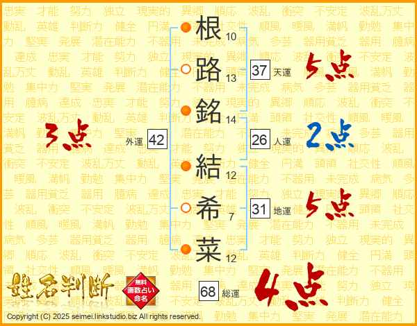 根(10画)路(13画)銘(14画) 結(12画)希(7画)菜(12画)