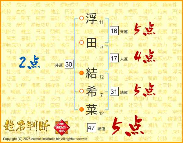 浮(11画)田(5画) 結(12画)希(7画)菜(12画)