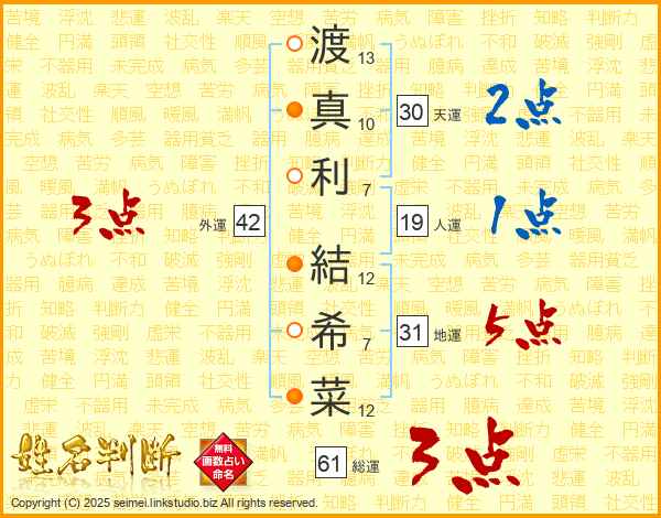渡(13画)真(10画)利(7画) 結(12画)希(7画)菜(12画)