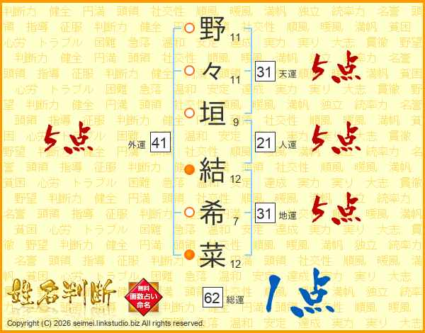 野(11画)々(11画)垣(9画) 結(12画)希(7画)菜(12画)