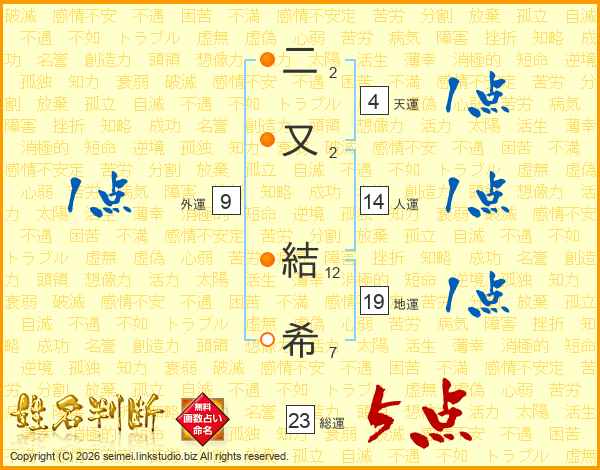 生活面を象徴する運勢です。外部から受ける影響力を表し、結婚運、家庭運や職場、環境への順応性を表します。総運から人運を引いた画数。姓や名が1文字の場合を除く。