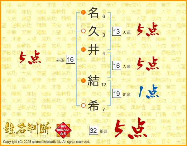 名(6画)久(3画)井(4画) 結(12画)希(7画)