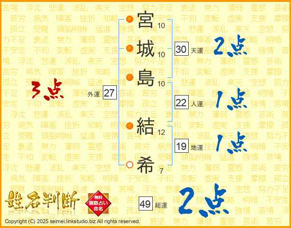 宮(10画)城(10画)島(10画) 結(12画)希(7画)
