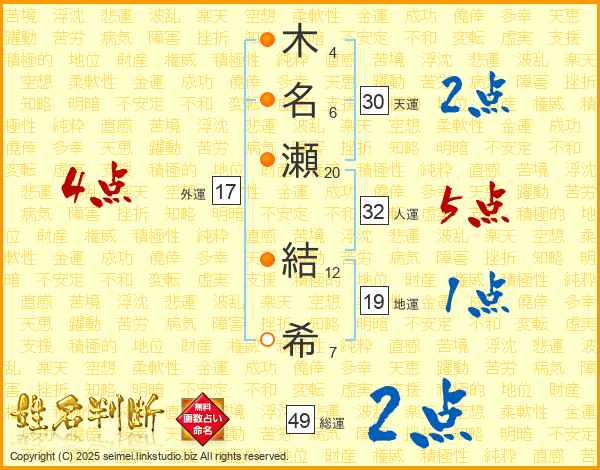木(4画)名(6画)瀬(20画) 結(12画)希(7画)