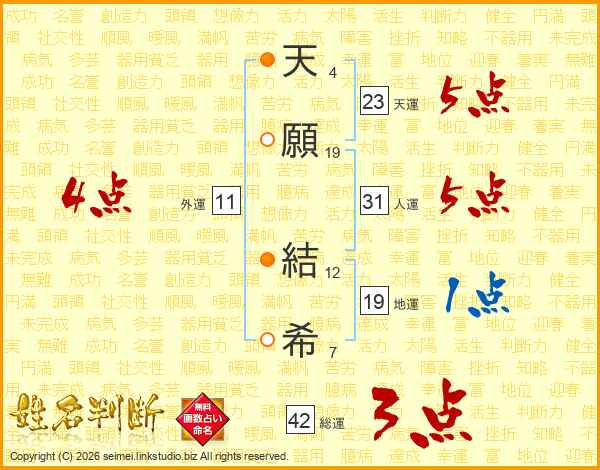 天(4画)願(19画) 結(12画)希(7画)