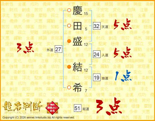 慶(15画)田(5画)盛(12画) 結(12画)希(7画)
