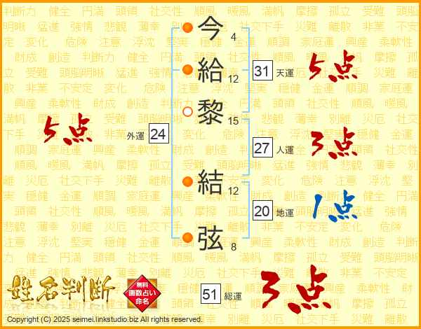 今(4画)給(12画)黎(15画) 結(12画)弦(8画)