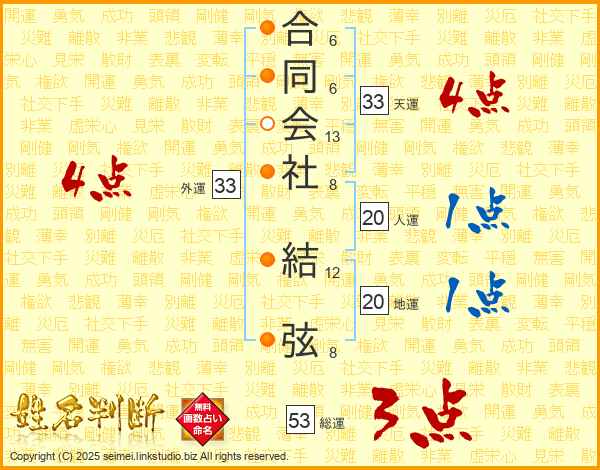 合(6画)同(6画)会(13画)社(8画) 結(12画)弦(8画)