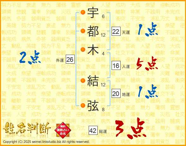 宇(6画)都(12画)木(4画) 結(12画)弦(8画)