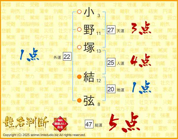 小(3画)野(11画)塚(13画) 結(12画)弦(8画)