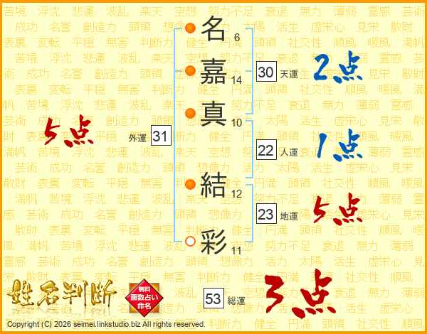 名(6画)嘉(14画)真(10画) 結(12画)彩(11画)