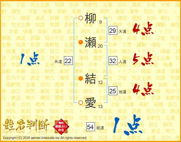 柳(9画)瀬(20画) 結(12画)愛(13画)