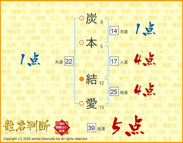 炭本結愛さんの総運は39画の5点!