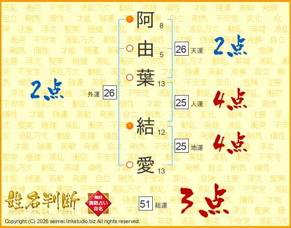 阿(8画)由(5画)葉(13画) 結(12画)愛(13画)