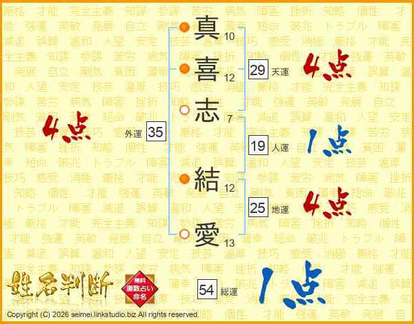 真(10画)喜(12画)志(7画) 結(12画)愛(13画)