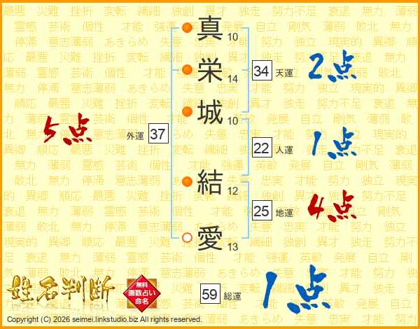真(10画)栄(14画)城(10画) 結(12画)愛(13画)