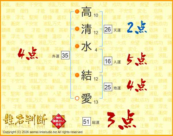 高(10画)清(12画)水(4画) 結(12画)愛(13画)