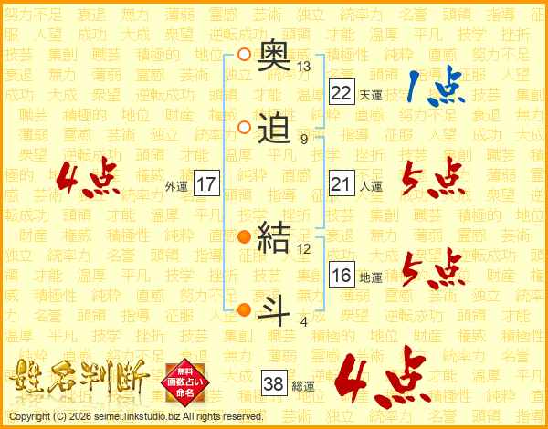 奥迫結斗さんの総運は38画の4点!