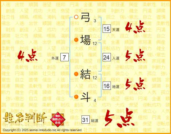 生活面を象徴する運勢です。外部から受ける影響力を表し、結婚運、家庭運や職場、環境への順応性を表します。総運から人運を引いた画数。姓や名が1文字の場合を除く。