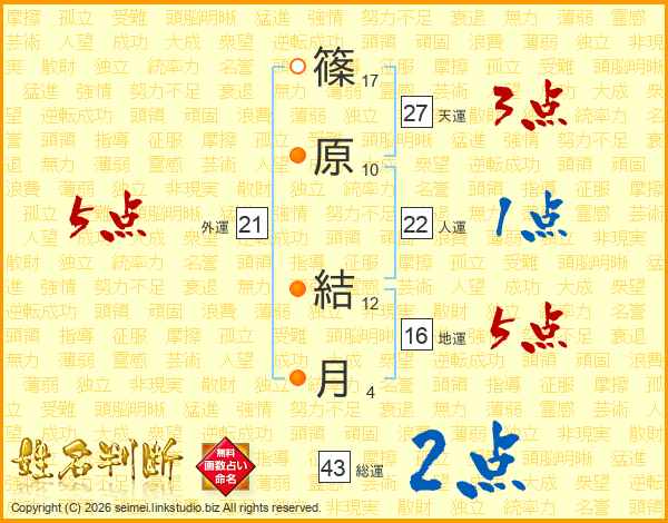 生活面を象徴する運勢です。外部から受ける影響力を表し、結婚運、家庭運や職場、環境への順応性を表します。総運から人運を引いた画数。姓や名が1文字の場合を除く。